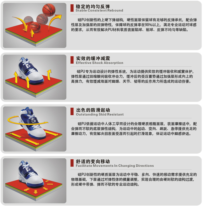 只有真正理解專業(yè)運(yùn)動(dòng)感覺(jué)的人才知道健康運(yùn)動(dòng)場(chǎng)地需要的是什么,正因?yàn)閷?duì)健康運(yùn)動(dòng)的崇尚和熱愛(ài),以及對(duì)專業(yè)運(yùn)動(dòng)感覺(jué)的追求,才能憑借雄厚的研發(fā)實(shí)力為硅PU注入了足以媲美木質(zhì)地板的運(yùn)動(dòng)特性。