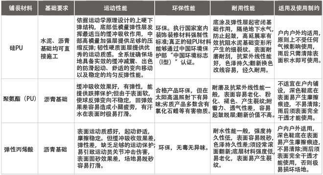 各類戶外運(yùn)動(dòng)場(chǎng)地合成面層材料性能對(duì)比: