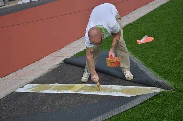 接下來就是把人工草坪用粘貼帶逐個的進行粘貼,使用專門的馬貝膠水對草皮進行鋪設,然后還有進行平整的擠壓,使其盡快的粘貼,中間不留痕跡,同時還有就是不同板塊的草坪之間進行銜接,標準的要求是不能超過3mm?p隙太大,在使用的過程中可能會產(chǎn)生很多的事故并且嚴重的情況下會危害運動員的職業(yè)生涯。