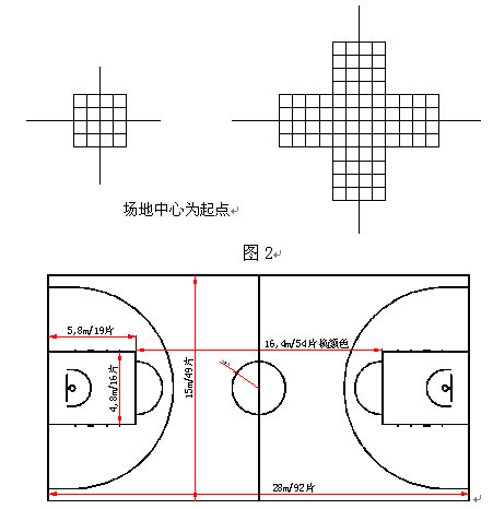 四、在場地中心點開始安裝地板,以中心線為起點由內(nèi)向外安裝,先安裝場地基本結構十字架到兩端見(圖2),再由內(nèi)向外安裝整個場地,場地面積所需地板數(shù)量見(圖),