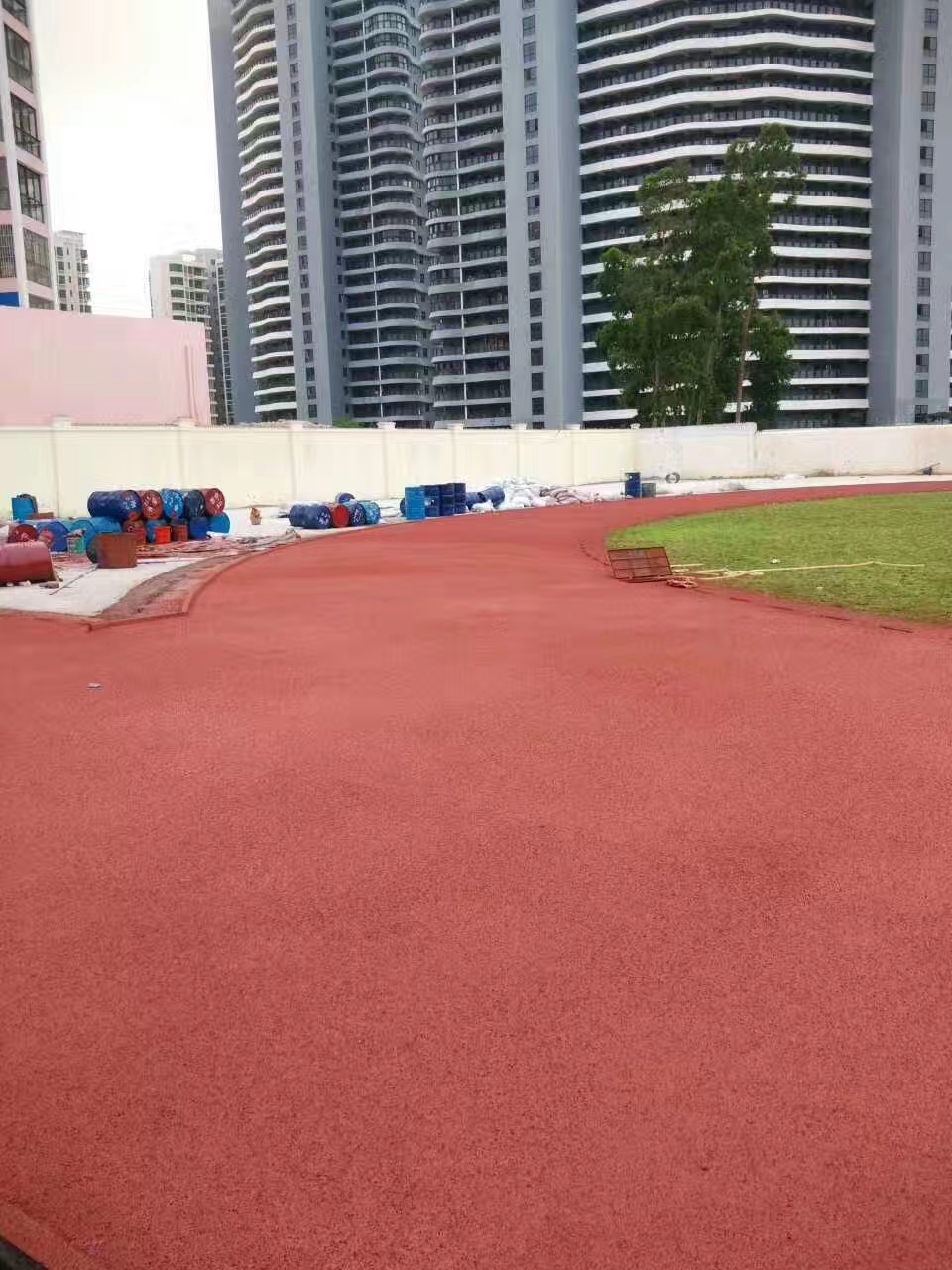 底層顆粒層,攤鋪厚度為10-11毫米,將其固化后,在上面再噴涂厚度為2-3毫米的EPDM顆;旌螾U膠液層。(注:若現(xiàn)場場地高低凹凸不平,則攤鋪厚度需以現(xiàn)場場地情況為基準決定厚度,以保證攤鋪完成后的平整度)。